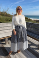 The Lucie skirt combines timeless elegance with versatile style. Crafted in navy blue and white stripes, this piece effortlessly transitions from casual daytime wear to refined evening occasions. The classic striped pattern adds visual interest while maintaining a polished aesthetic, making it an essential addition to any wardrobe.